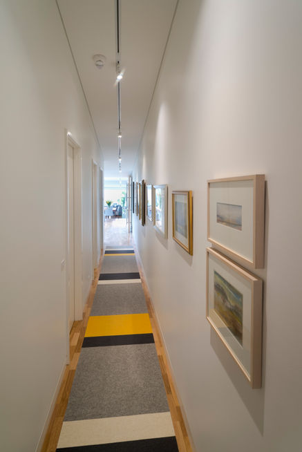 Recessed track lighting down the length of the house provides a gallery setting that shows the clients extensive art collection to best advantage. The stable conversion allows for additional accommodation across the garden courtyard from the main house.